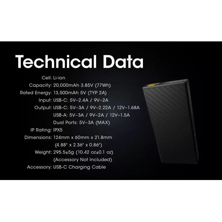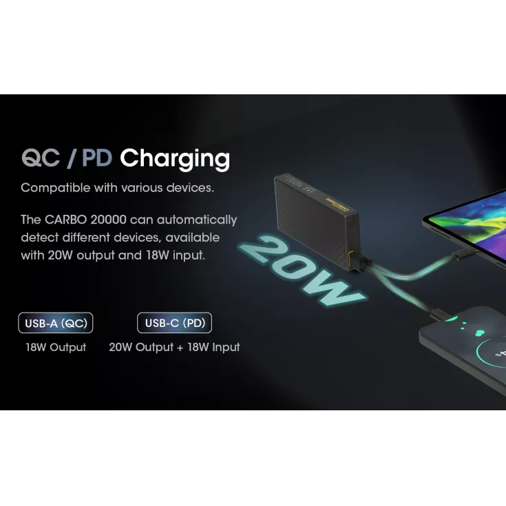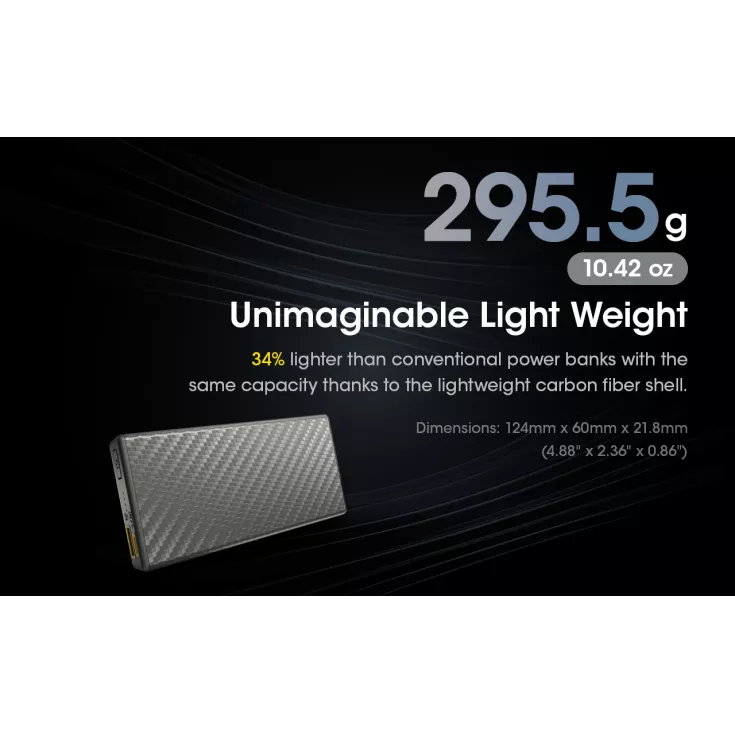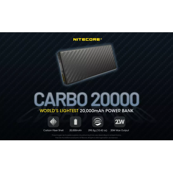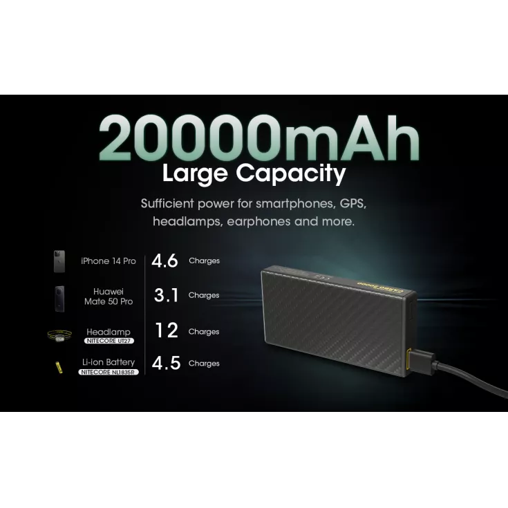 The Nitecore Carbo 20000 Power bank is the worlds lightest 20,000mAh power bank created with carbon fibre reinforced polymer (CFRP). This material is widely used in aerospace and automotive engineering due to its ultralight, corrosion resistant and high strength construction.