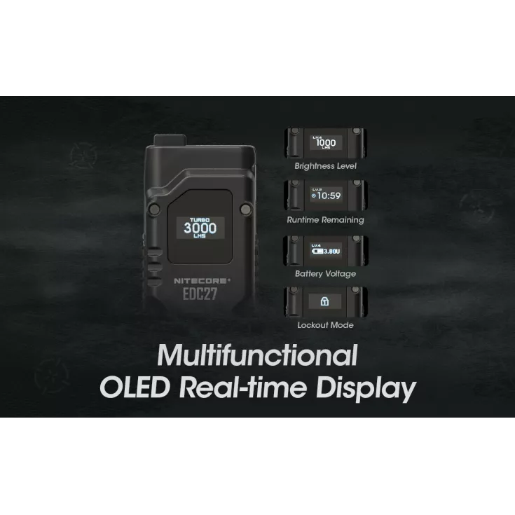 A multifunctional OLED display shows the brightness level, remaining runtime, battery voltage and if the light is in lockout mode. Two lockout modes are available, half lockout that still enables access to strobe and turbo and full lockout, ideal when carrying or storing the EDC27.