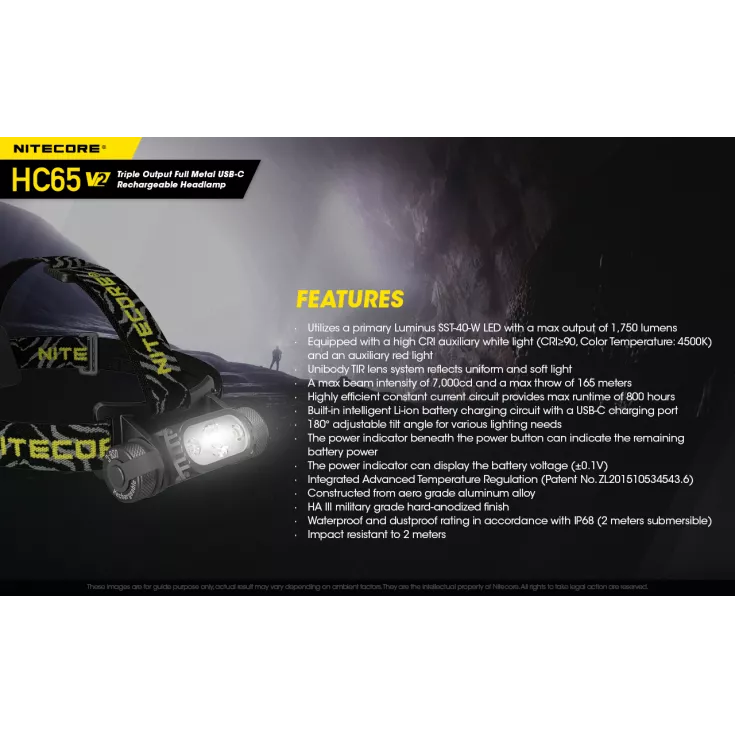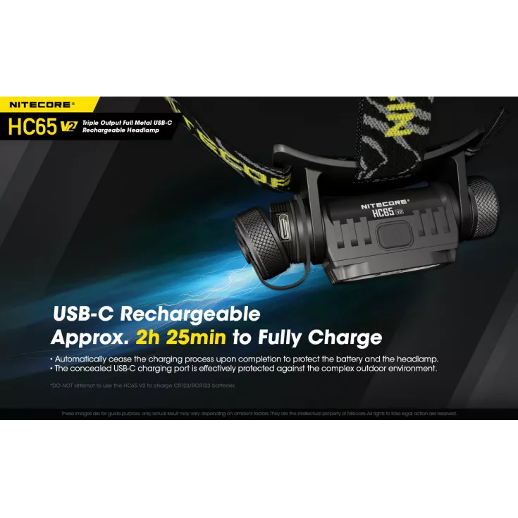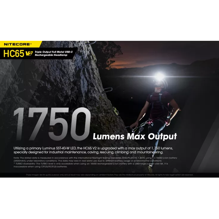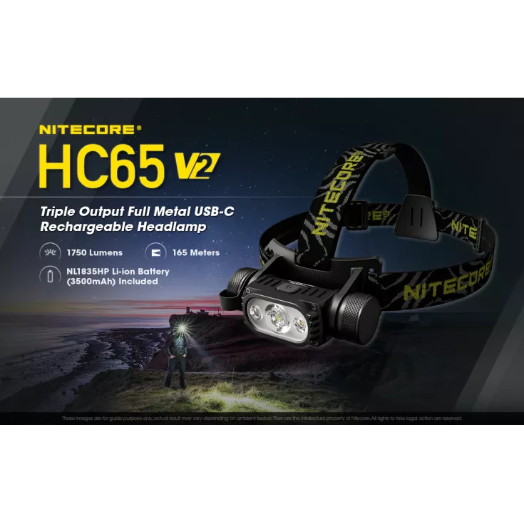 Nitecore HC65 V2 includes: Nitecore NL1835HP 3500mAh 18650 8A li-ion battery, spare o-ring, USB-C charging cable, headband and bracket.