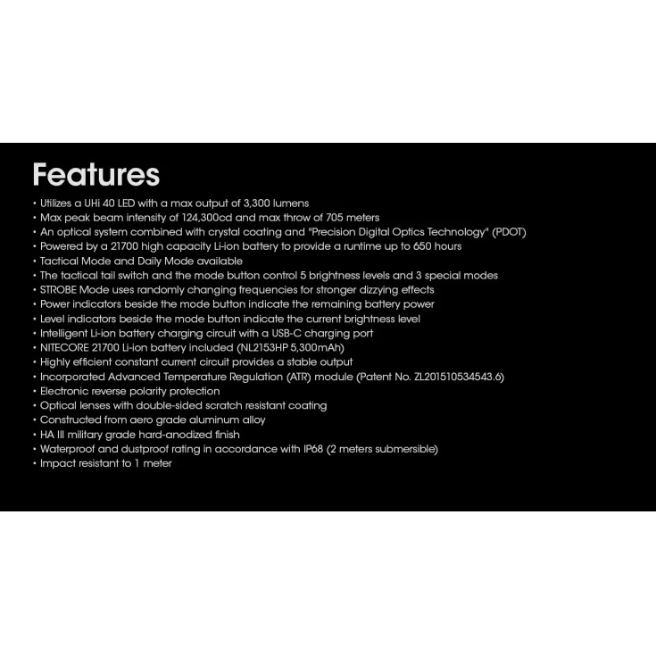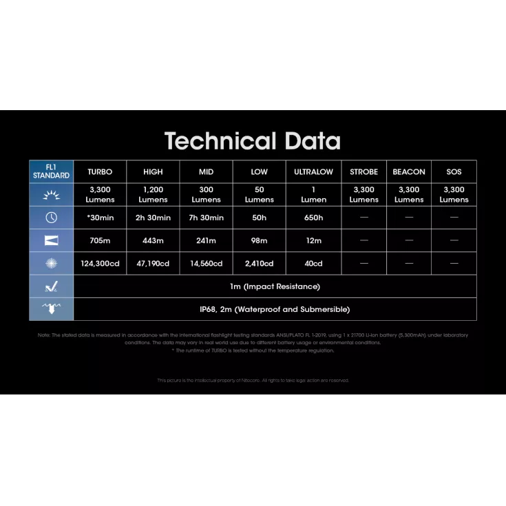 Turbo: 3300 lumens – 30 minutes -705 meters