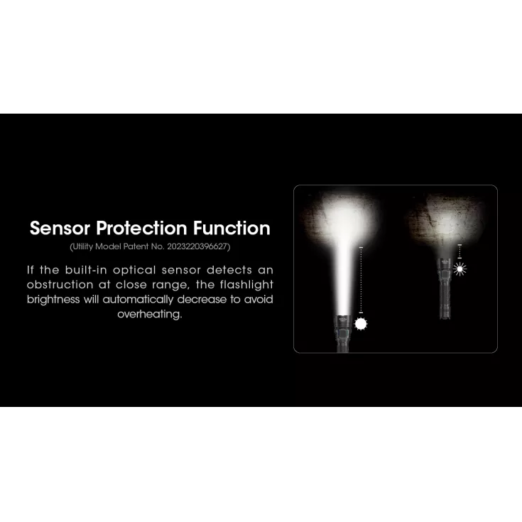 The round light emitting surface of the UHi 40 LED is a perfect match for the round reflector, enabling high light conversion efficiency and a bright and clear hotspot, which is conductive to identifying targets at night quickly and accurately. A built-in optical sensor detects obstructions at close range and automatically decreases brightness to prevent overheating.