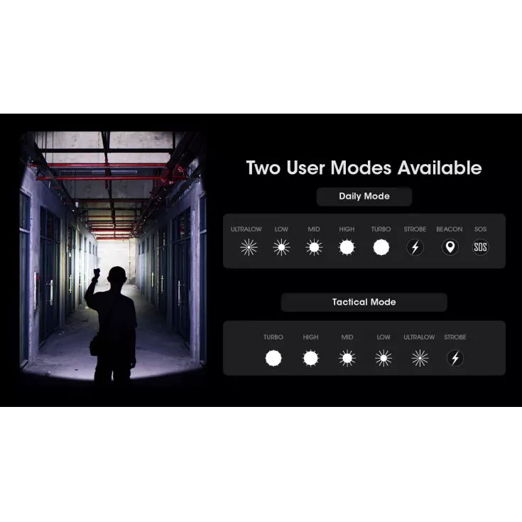 Operation is via dual switches. The tail switch turns the light on and off (with momentary-on function) and the mode button on the side of the head is used to select the brightness level / mode. Two user modes are available, daily mode and tactical mode.