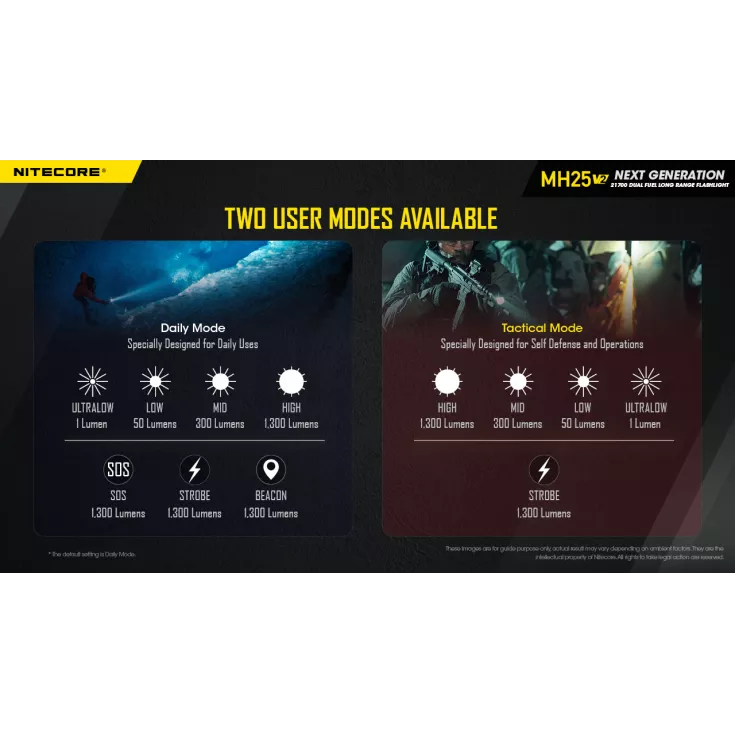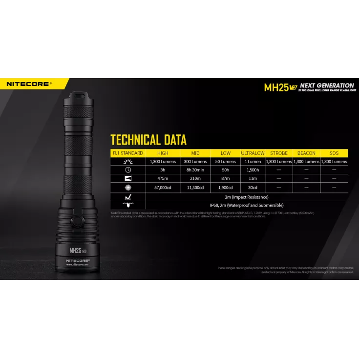 The MH25 V2 has a maximum output of 1300 lumens and a beam distance of 475 meters. The torch is rechargeable using the USB-C cable provided. The torch is also compatible with 18650 and CR123 batteries (available separately). Operation is via dual switch setup with a forward click tactical tail switch with momentary-on functionality and a metal side switch to change brightness. A blue indicator light is built into the side switch and flashes to display the remaining battery voltage.
