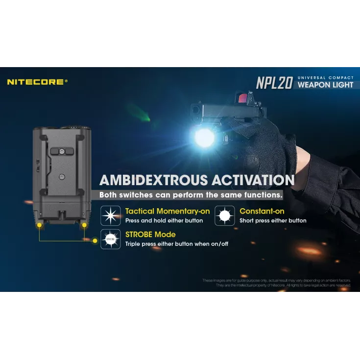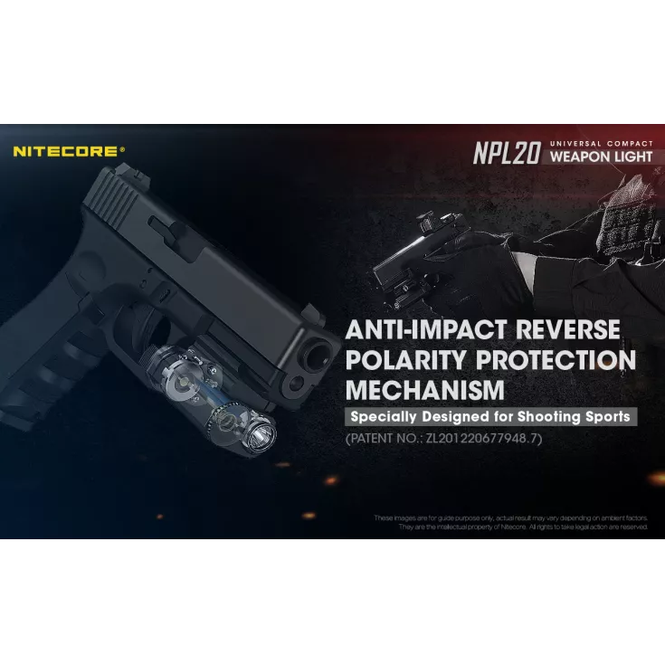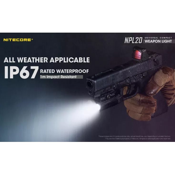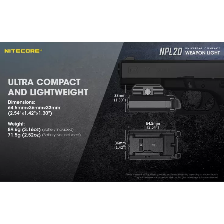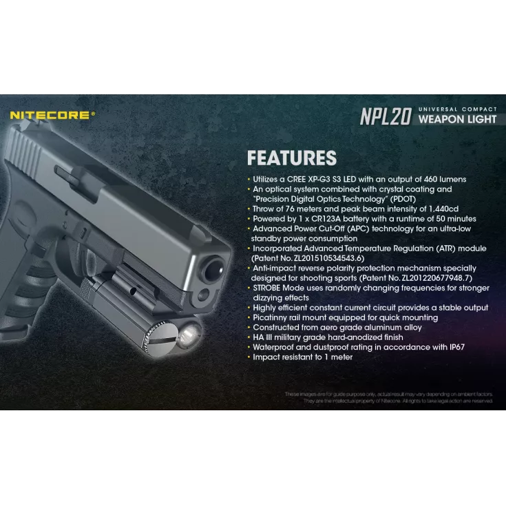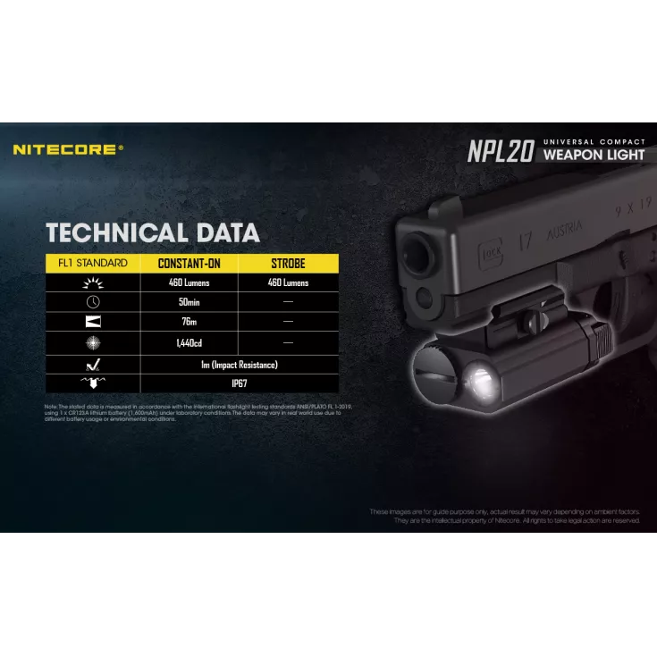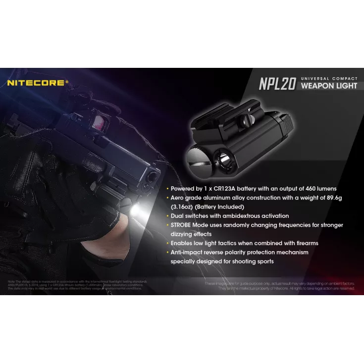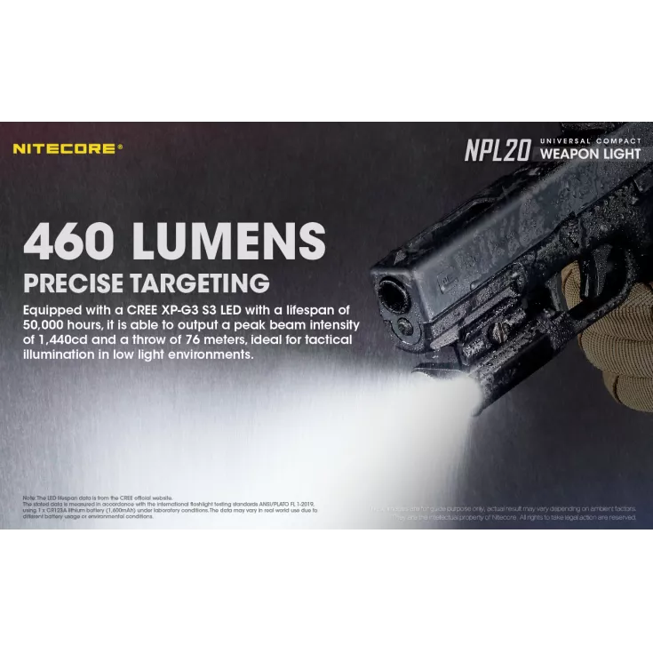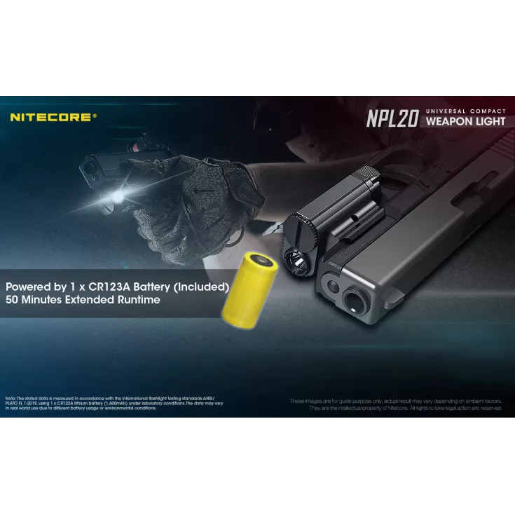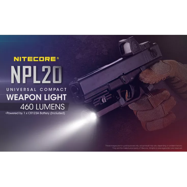 The Nitecore NPL20 is a universal compact weapon light with a single brightness level of 460 lumens and powered by a single CR123 battery (included) and a runtime of up to 50 minutes.