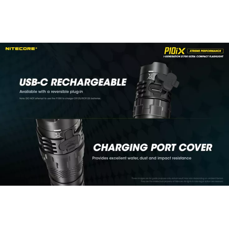 Nitecore P10iX includes: Nitecore NL2150HPi 5000mAh li-ion 21700 battery, NTH10 tactical holster, pocket clip, wrist lanyard, spare o-ring, CR123 battery magazine and USB-C charging cable.