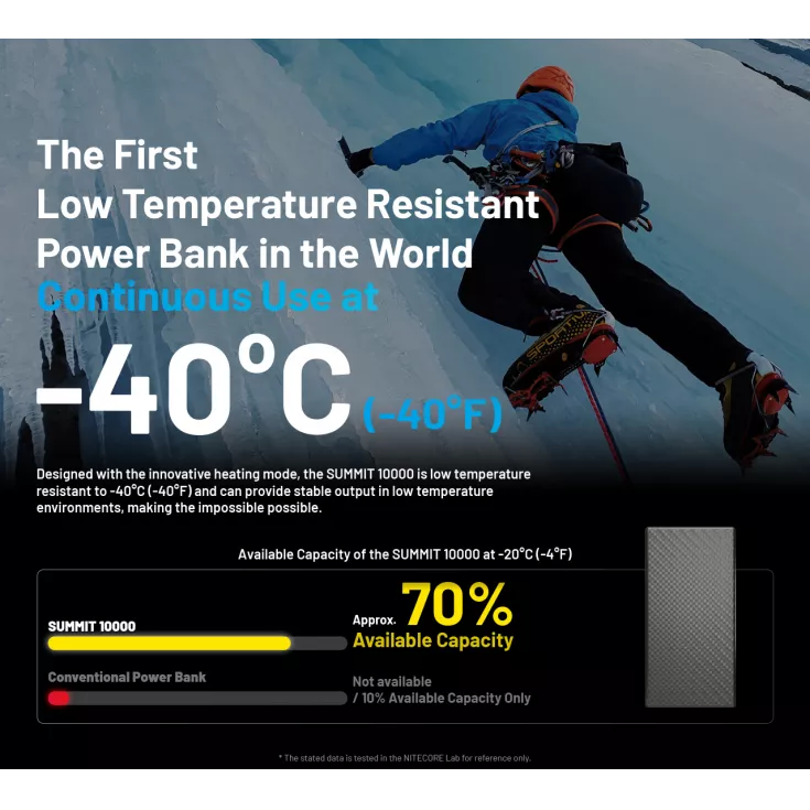 The Nitecore Summit 10000 Power bank has been designed with an innovative heating mode, enabling the power bank to provide a stable output in low temperature environments, as low as -40°C. Equipped with the PI heating system, the power bank has high efficiency and high speed heating performance to ensure the battery can work at an appropriate temperature for reducing the loss of power.