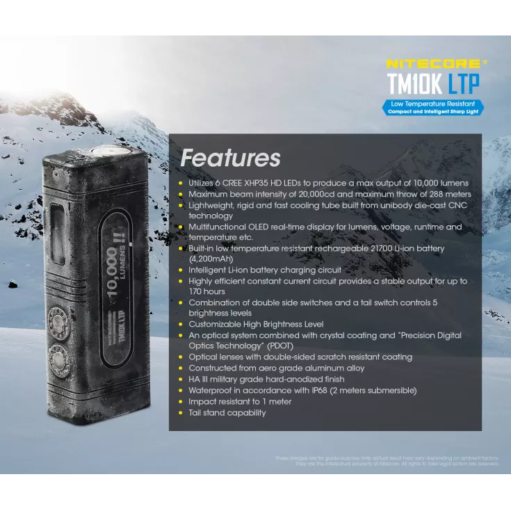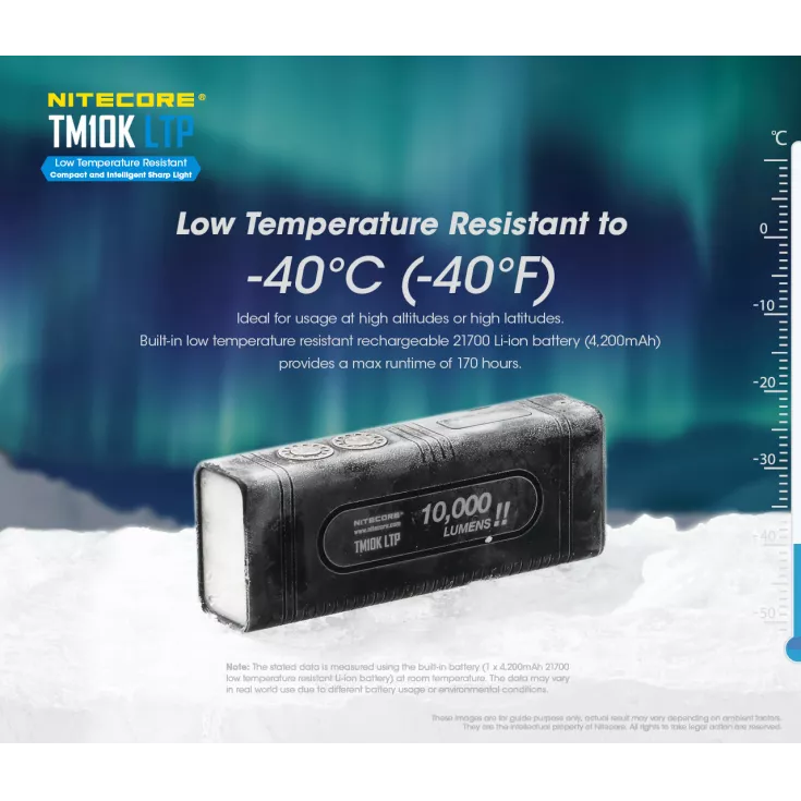 The flashlight is compact, light and specifically designed for temperatures as low as -40°C. It is ideal for usage at high altitudes and high latitudes. It has a built-in low temperature resistance rechargeable 2100 Li-ion battery that provides a maximum runtime of 170 hours.