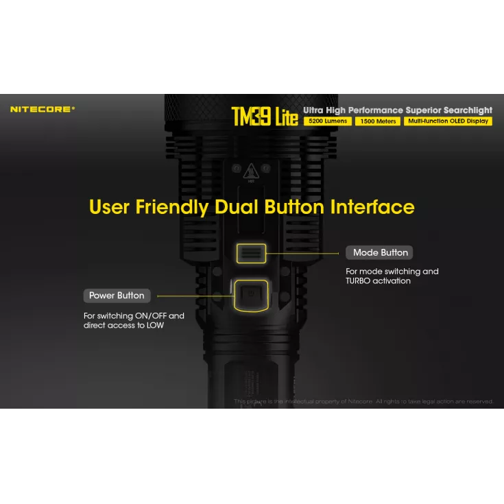 The Nitecore TM39 Lite has the same head as the TM39 but a shorter body, housing 4 x 18650 li-ion batteries rather than the NBP68HD battery pack the standard model comes with. The flashlight has the same fantastic maximum output of 5200 lumens from the Luminus SBT-90 Gen 2 LED and a maximum beam distance of 1500 meters.