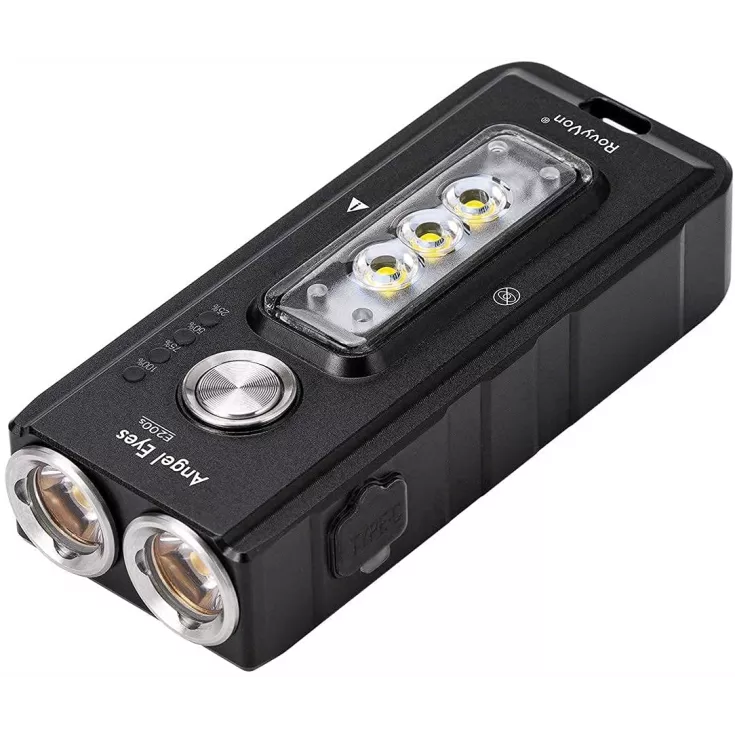 The RovyVon Angel Eyes E200s torch has an impressive maximum output of 1650 lumens from the CREE XP-G3 LEDs and is powered by a built-in 1400mAh lithium polymer battery. In addition to the front LED, the E200s also features a sidelight with a more neutral beam tint of 5000K and a maximum output of 1000 lumens.