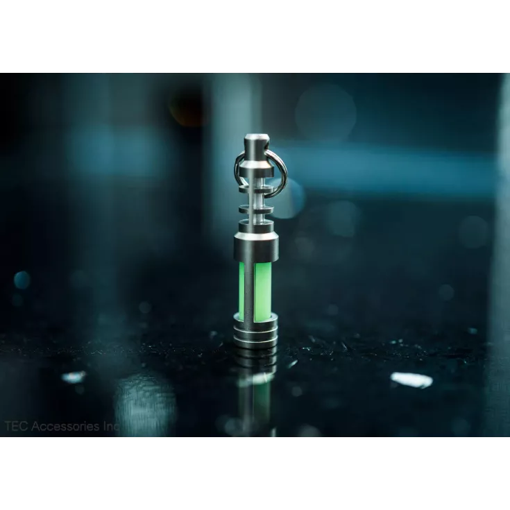 The Chain Reaction fob is designed around two light sources; the Embrite glow pellet (included) and a 3mm x 11mm tritium vial (not included). The Embrite pellet works by taking its ‘charge’ from sun or UV light, providing a bright glow once darkness comes. However, as the pellet requires a light source to recharge, this is where the tritium vial comes in as it can glow for years without needing to be recharged.