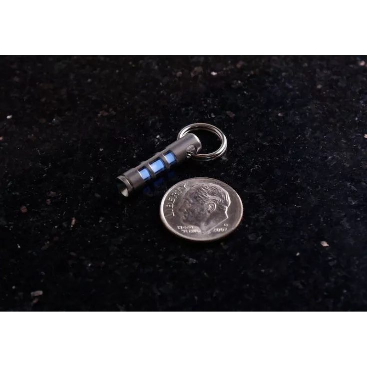 Unlike the conventional line of glow fobs, the Isotope was designed around the use of a glass tritium vial. This makes it noticeably smaller than our standard glow fobs, and allows it to glow continuously without any type of charging cycle! The Isotope is a stainless steel housing, bead blasted to a uniform matte finish. There are 3 slots on each side of the housing to provide maximum tritium visibility, yet offers superior protection of the glass vial. Once the tritium is installed, you simply insert the included rubber plug (spares included) and attach the top split ring. This prevents the tritium vial from sliding out, yet provides an easy way to exchange vials if you want a different color.